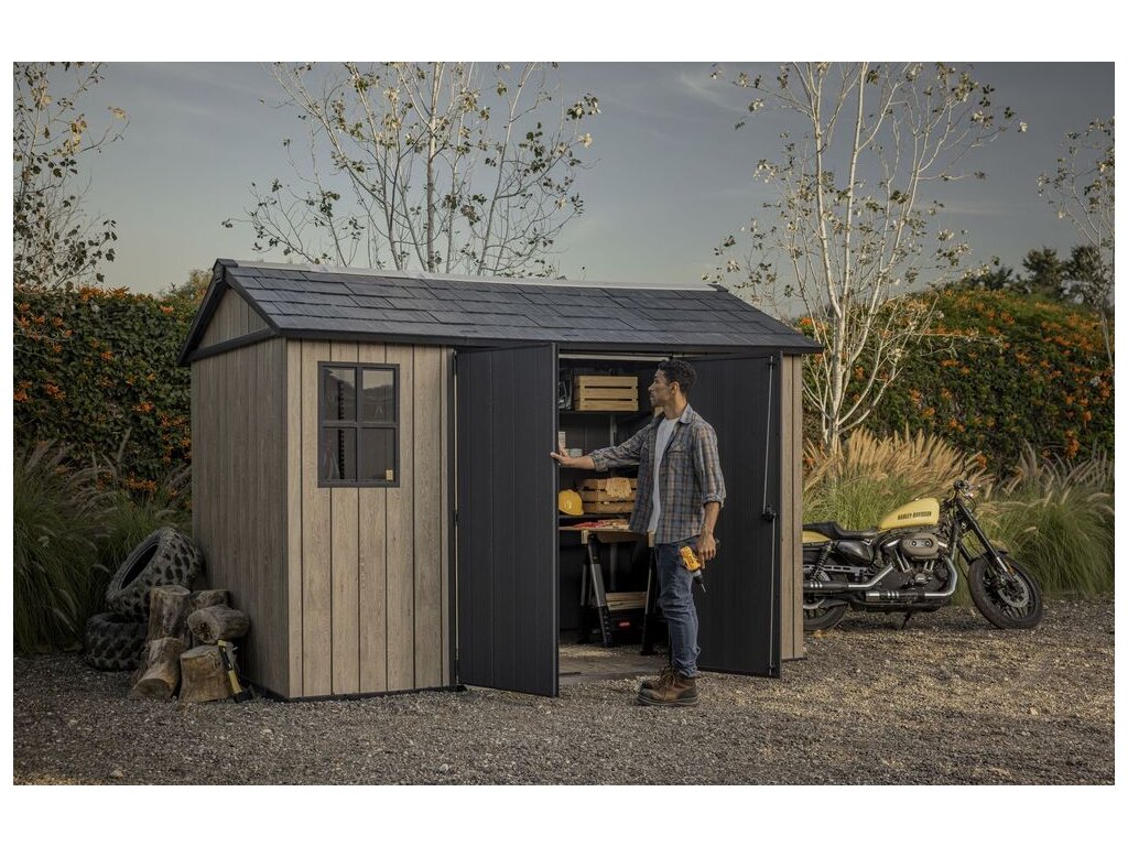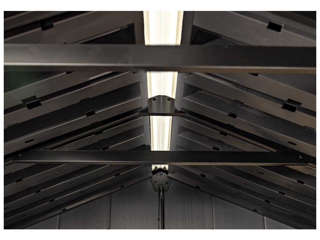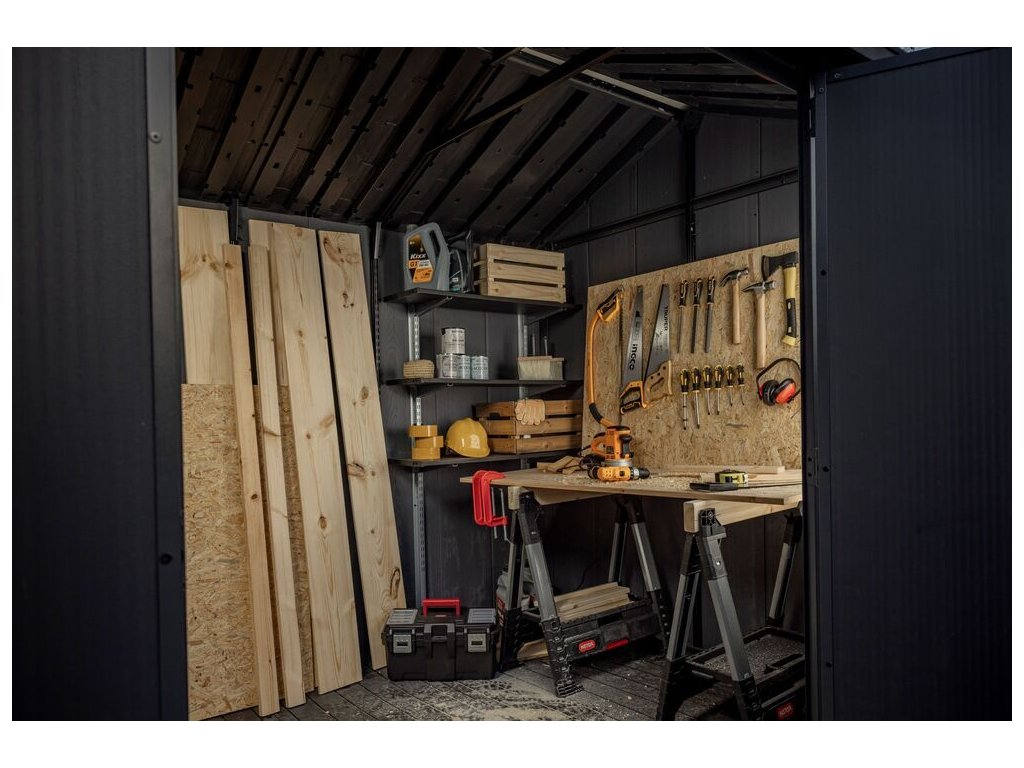 S jeho dvojitými stěnami a možností flexibilního sestavení, APEX 11x7,5 se může přizpůsobit jakémukoli prostoru. Stejně tak umístění okna a dveří je možné uzpůsobit. Díky širokým dvojitým dveřím a pevné designové střeše se stává ideálním úkrytem pro širokou škálu zahradního náčiní, nábytku a sekaček. Jeho vysoce odolná podlaha, schopná unést až 150 kg na metr čtvereční, poskytuje spolehlivou základnu pro Vaše potřeby.