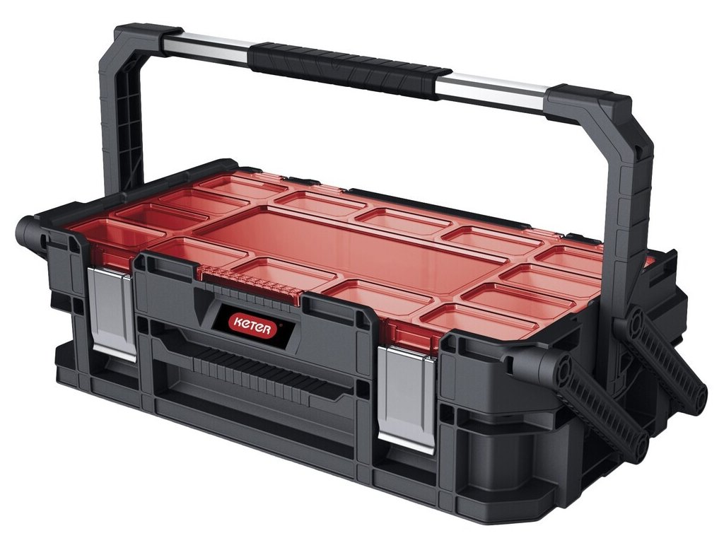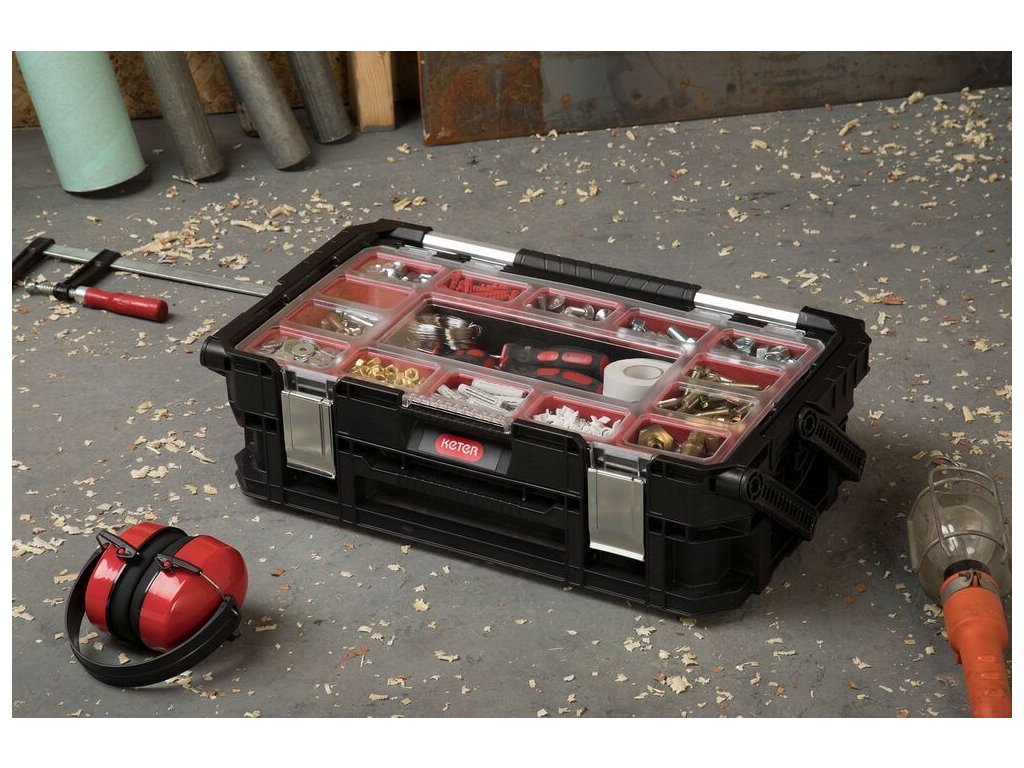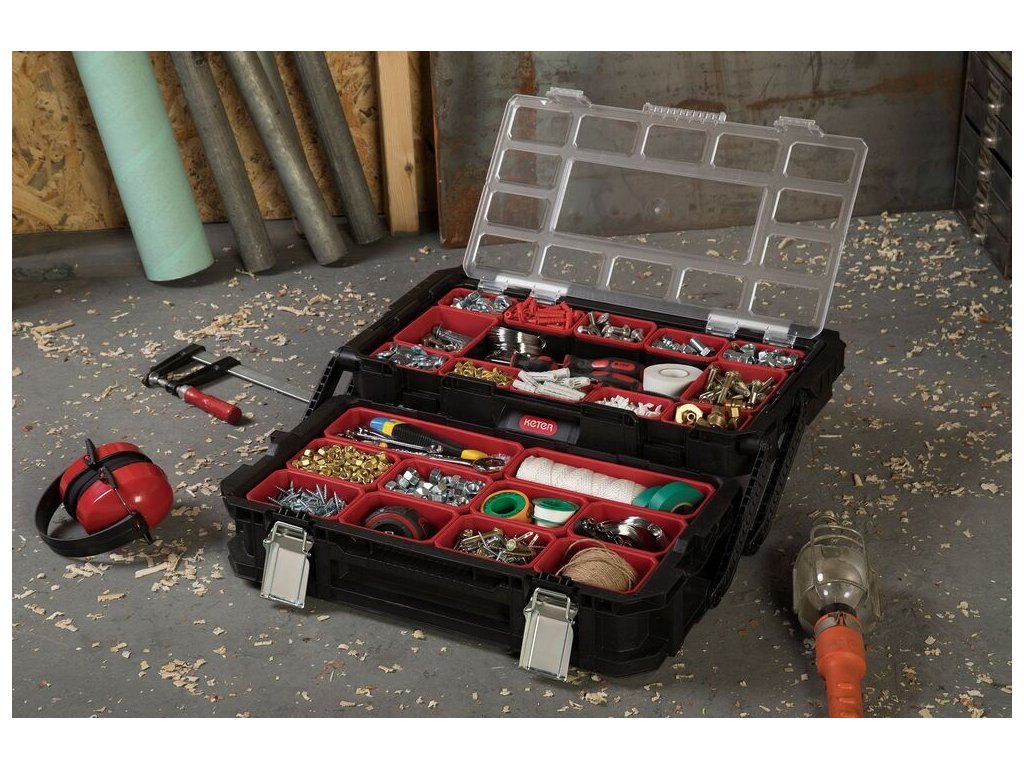 Díky průhlednému víku máte hned přehled, co kde je, takže nemusíte nic zbytečně přehrabovat. Pevná konstrukce zvládne časté přenášení i plné zatížení a pohodlná kovová rukojeť usnadňuje manipulaci. Organizér obsahuje kovové západky, které drží víko pevně uzavřené. Nosnost organizéru je až 15 kg.