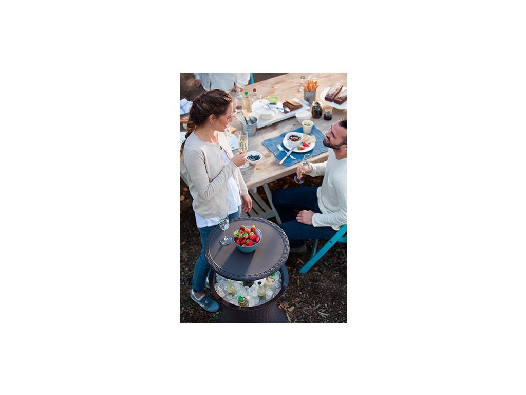 Multifunkční zahradní bar, který ve složeném stavu slouží jako praktický stůl a po vysunutí může sloužit jako klasický bar s boxem pro chlazení nápojů.