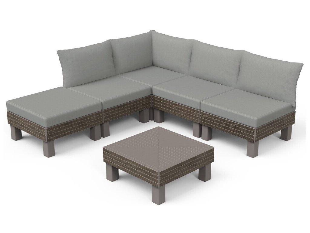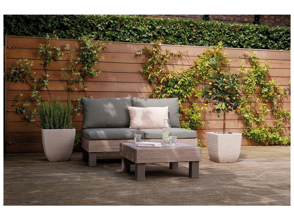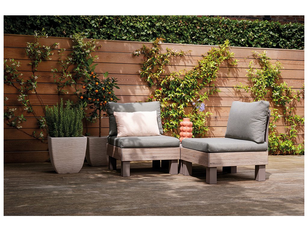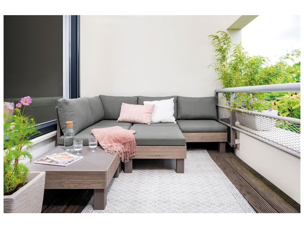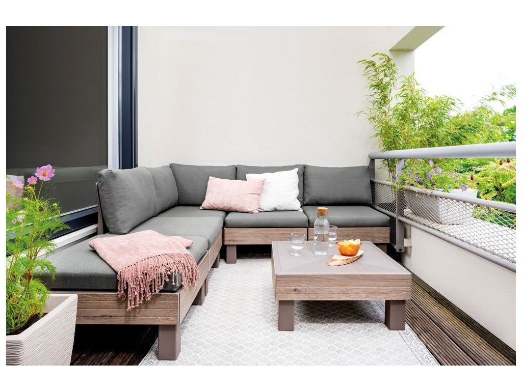 Pro ještě větší pohodlí jsou součástí soupravy 9 cm vysoké podušky a opěrky. Podušky jsou z příjemného materiálu polybavlna a spodní část je z netkané textílie s protiskluzovým tečkami. Pevný lisovaný plast, z kterého je souprava vyrobena, je odolný vůči nepříznivým povětrnostním podmínkám a UV záření.