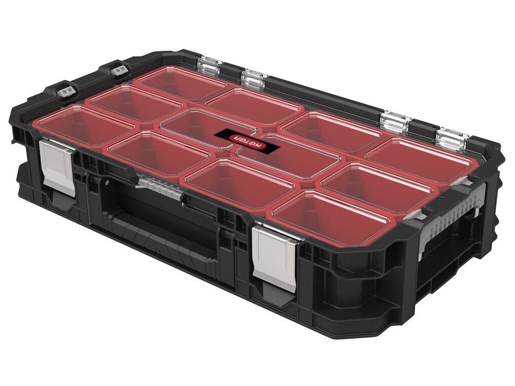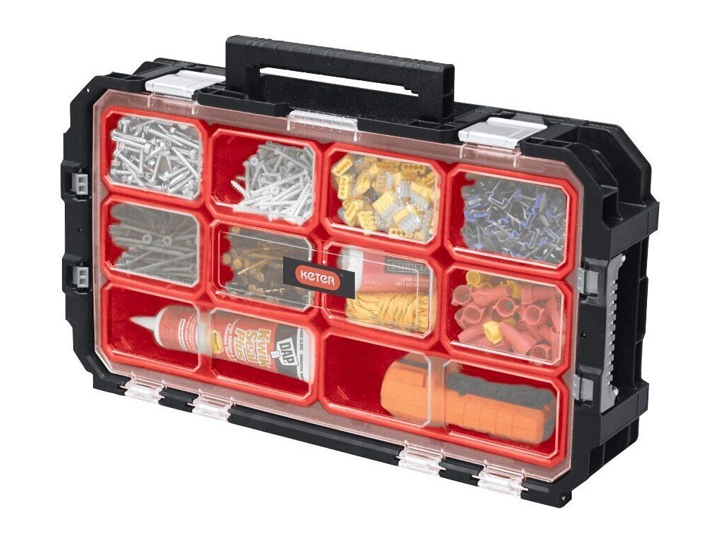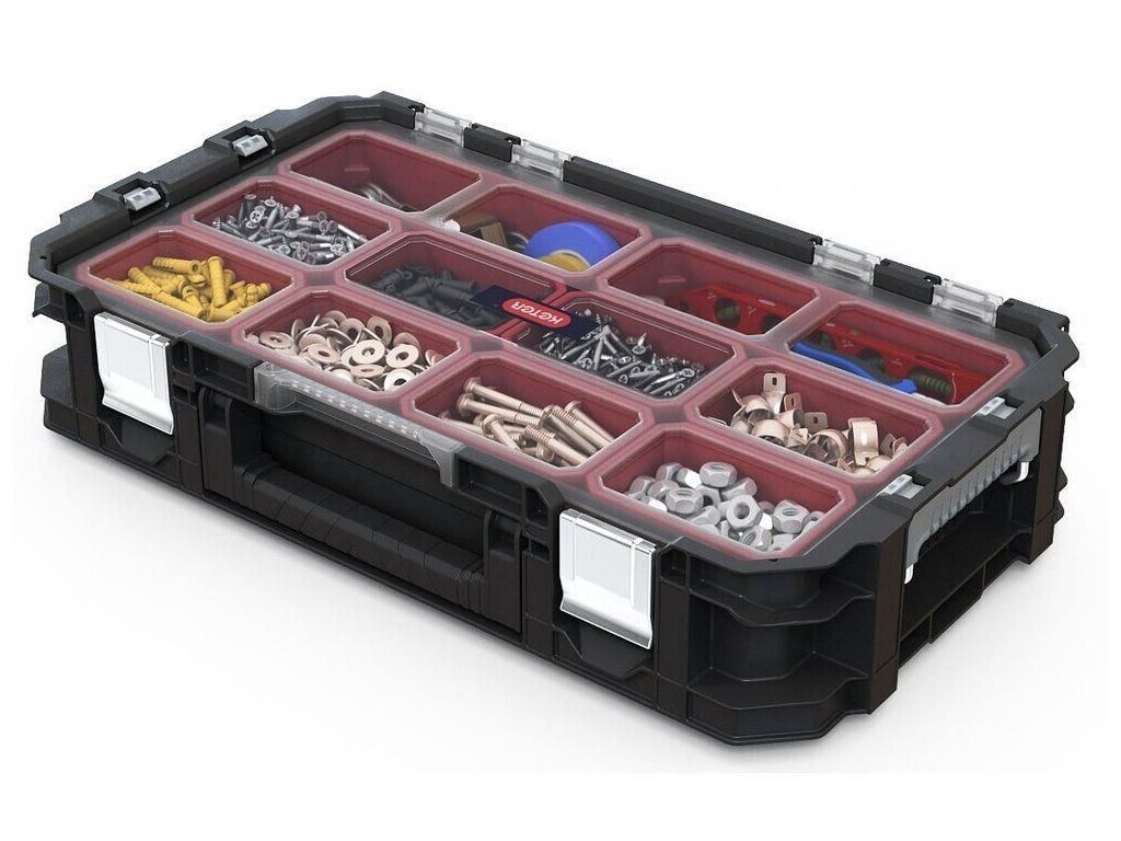 Uvnitř najdete 8 malých a 2 velké vyjímatelné přihrádky, které si můžete libovolně uspořádat dle aktuální potřeby. Průhledné víko umožní rychle zkontrolovat obsah bez otevírání.