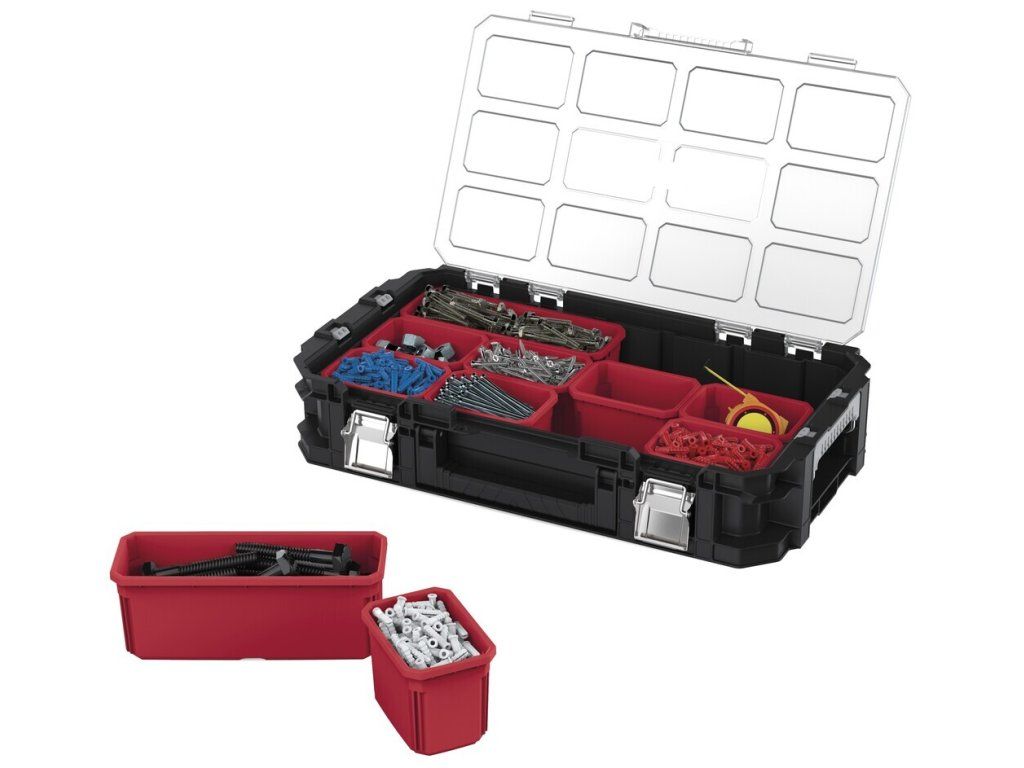 Organizér obsahuje kovové západky, které drží víko pevně uzavřené i při přenášení. Organizér je také vybaven pohodlnou rukojetí pro snadnou manipulaci. Nosnost organizéru je až 10 kg.