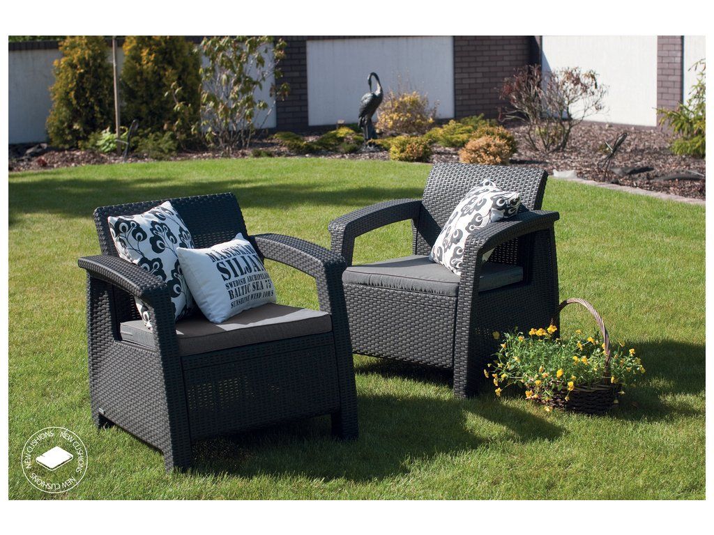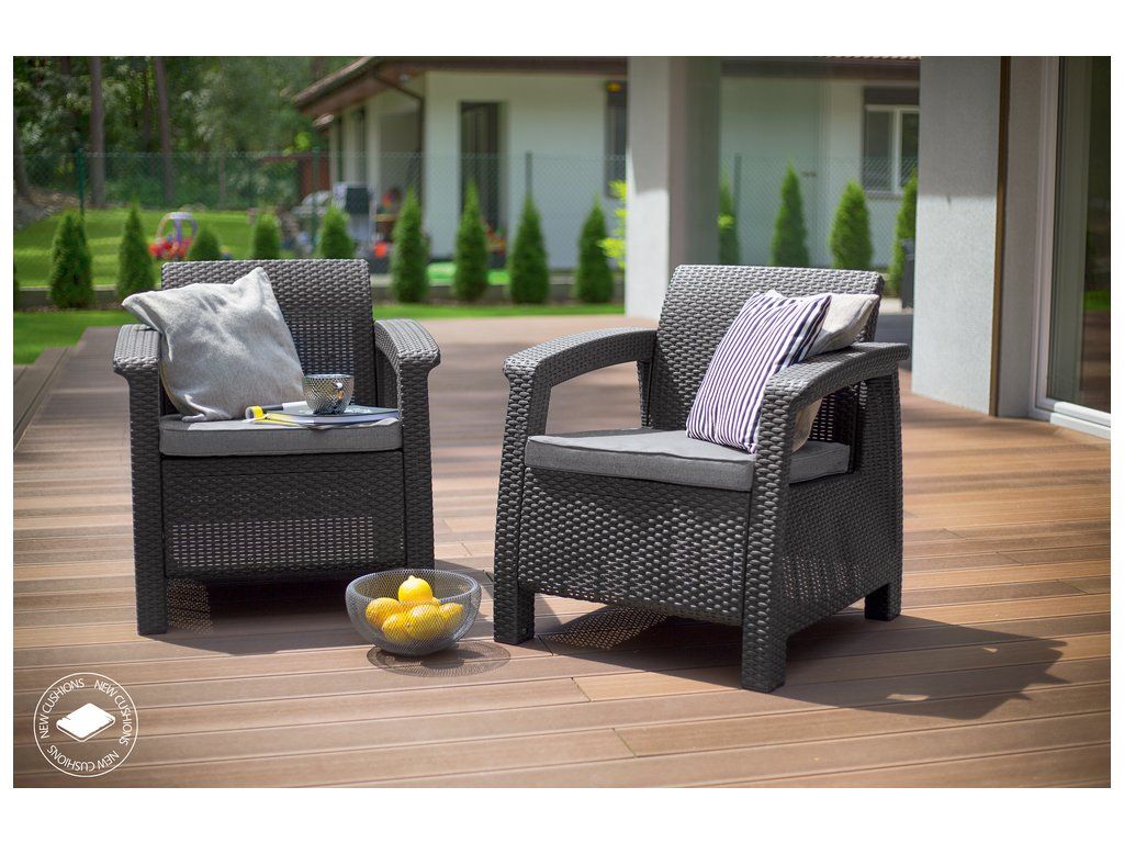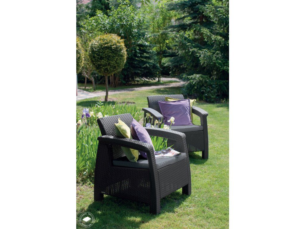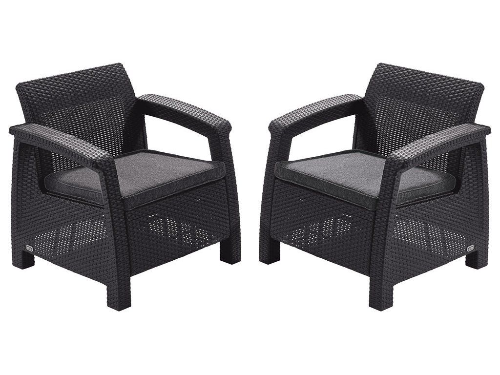 Dvě pohodlná křesla s měkkými poduškami a skvělým designem, jsou ideální do malých prostorů nebo jako doplnění jakéhokoliv setu corfu.