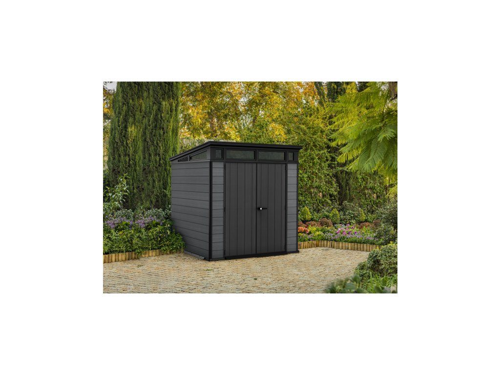 Je také vybaven pevnou designovou střechou, širokými dvojitými dveřmi a podlahou pro náročné použití s nosností 150kg na m2.