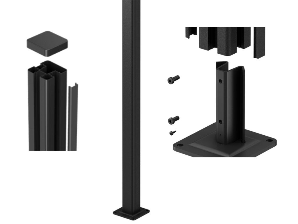 Součástí balení je hliníkový sloupek, ocelová patka a hliníková krytka, která zakryje sloupek a zajistí čistý vzhled. Šrouby k přivrtání do země nejsou součástí balení.