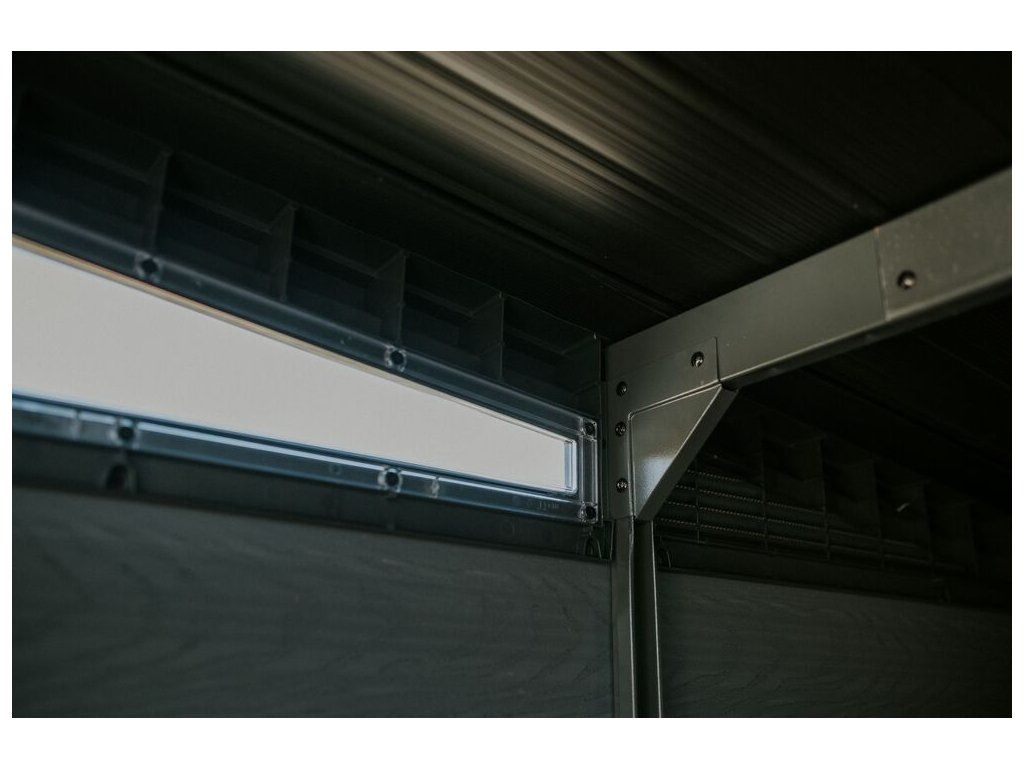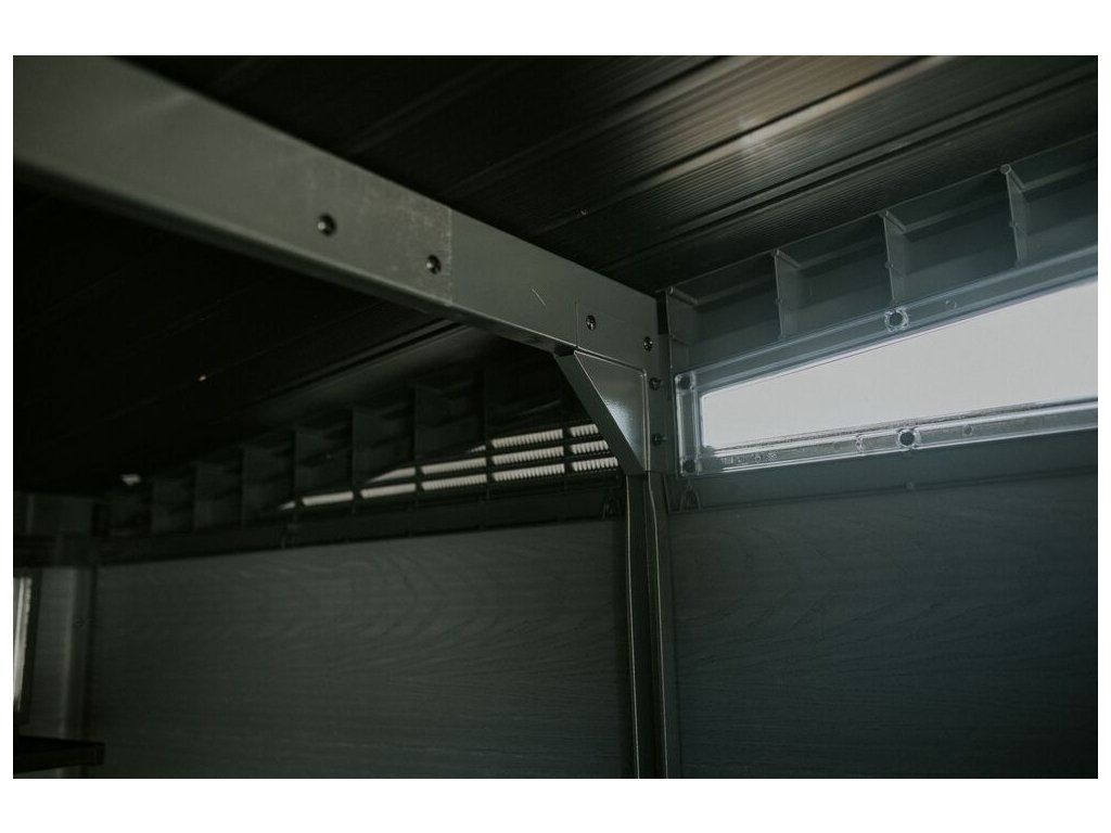 Je také vybaven pevnou designovou střechou, širokými dvojitými dveřmi a podlahou pro náročné použití s nosností 150kg na m2.