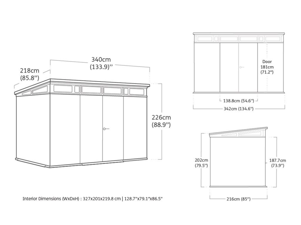 Je také vybaven pevnou designovou střechou, širokými dvojitými dveřmi a podlahou pro náročné použití s nosností 150kg na m2.