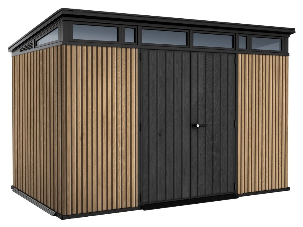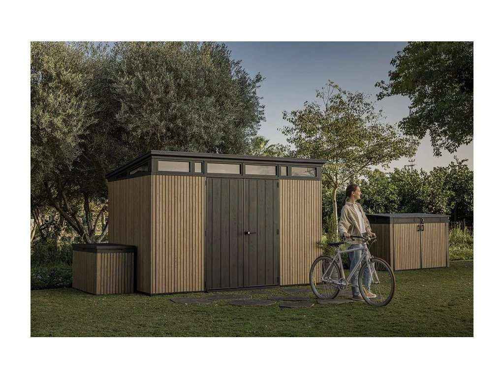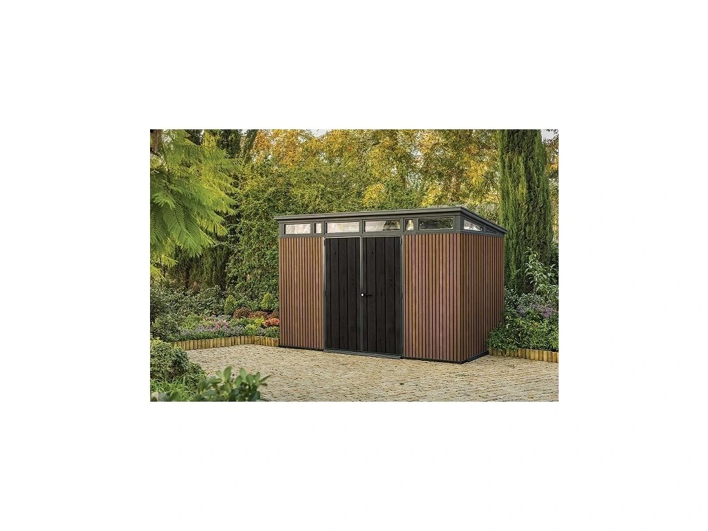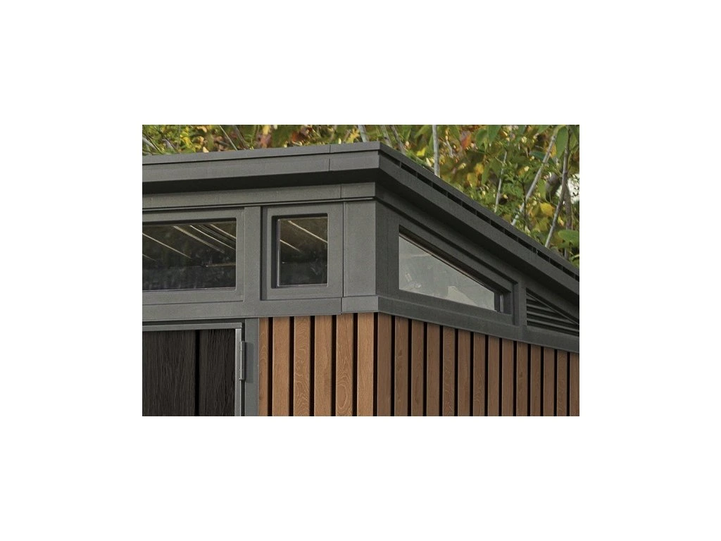 Bezúdržbový domek PENT 11x7 je vyroben z jedinečného materiálu DECOCOAT, který je inspirován moderním vzhledem v imitaci dřeva. Domek má robustní konstrukci s dvojitými stěnami a kovové výztuhy.