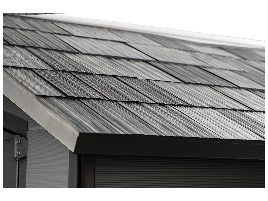 Je také vybaven pevnou designovou střechou, širokými dvojitými dveřmi a podlahou pro náročné použití s nosností 150kg na m2.