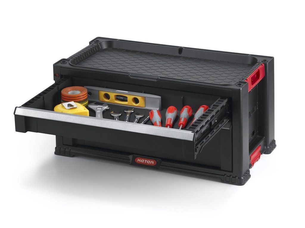 - jedna zásuvka je ještě rozdělena na menší přihrádky použitelné na spojovací materiál a jiné drobnosti
