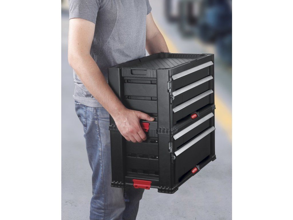 - masivní úložný box z pevného a odolného plastu se třemi shodně velkými zásuvkami
