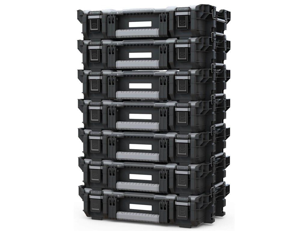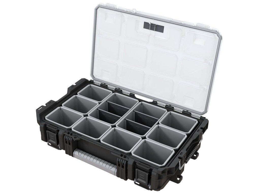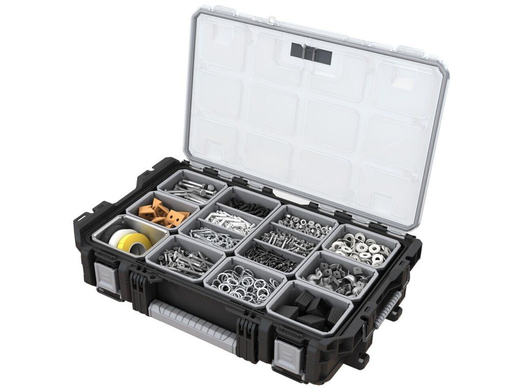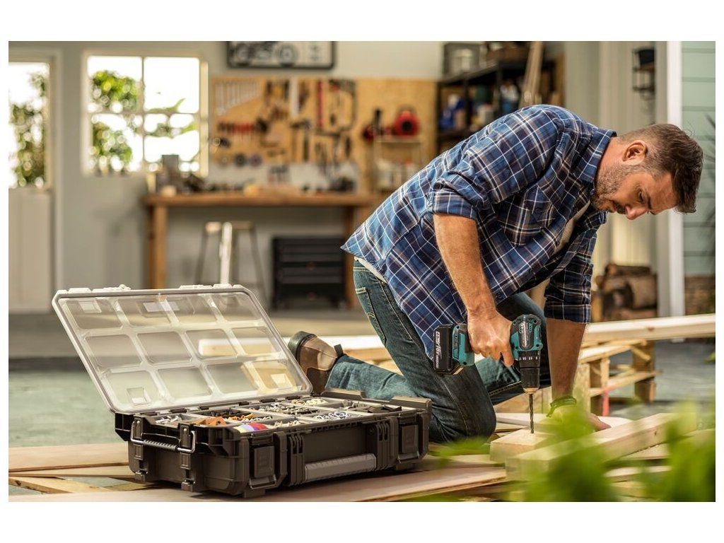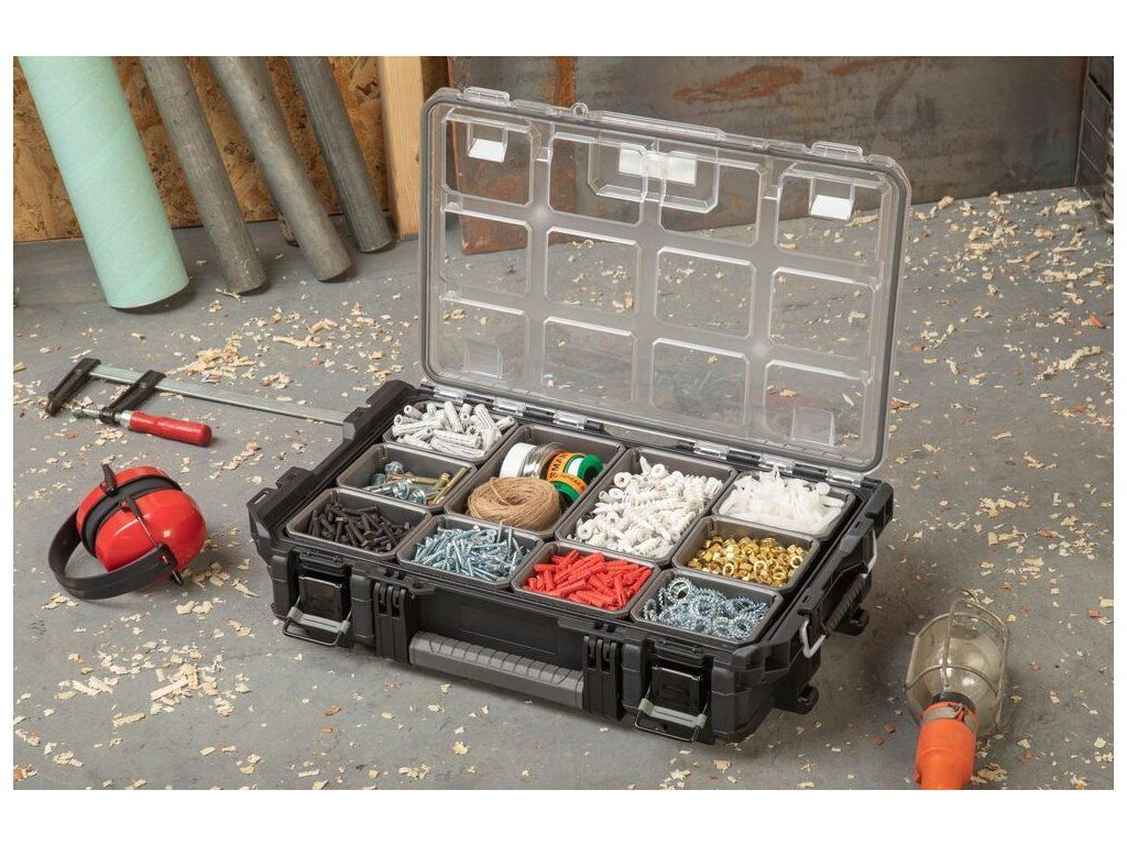 Praktický pomocník do dílny, který vám zaručeně pomůže udržet pořádek. Uvnitř je 8 menších a 2 větší vyjímatelné přihrádky, takže si obsah snadno uspořádáte dle aktuální potřeby. Průhledné víko umožňuje rychle zkontrolovat, co je uvnitř, aniž byste organizér museli otevírat a speciální těsnění (krytí IP65) chrání obsah před prachem a vodou. Odolné západky zajišťují bezpečné uzavření a tím minimalizují riziko vysypání obsahu. Organizér je dále vybaven rukojetí pro snadné přenášení. Nosnost organizéru je až 25 kg.