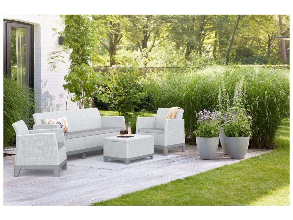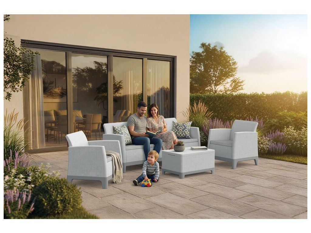 Velkou výhodou je rychlá montáž bez použití nářadí, díky které je sada připravena k použití během několika minut. Součástí setu jsou dvě pohodlná křesla, trojmístné sofa a praktický stolek s úložným prostorem, ideální pro uložení drobností, polštářků nebo zahradních doplňků.