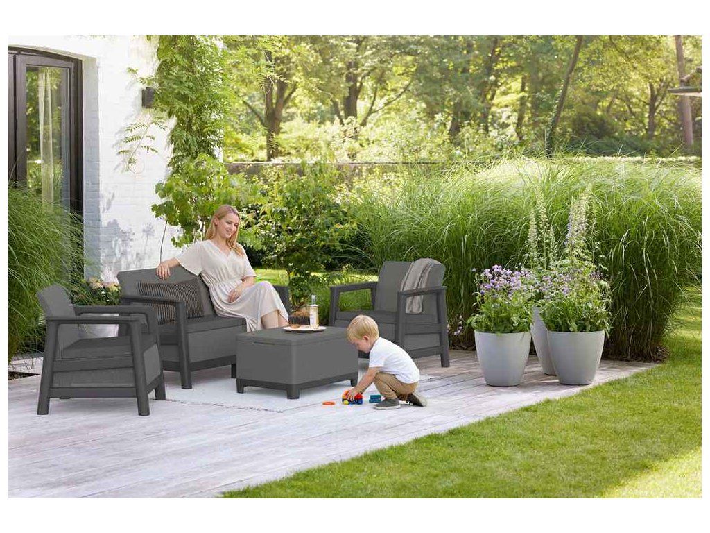 Velkou výhodou je rychlá montáž bez použití nářadí, díky které je sada připravena k použití během několika minut. Součástí setu jsou dvě pohodlná křesla, dvojmístné sofa a praktický stolek s úložným prostorem, ideální pro uložení drobností, polštářků nebo zahradních doplňků.