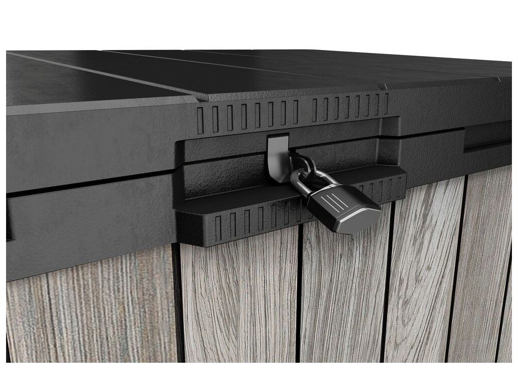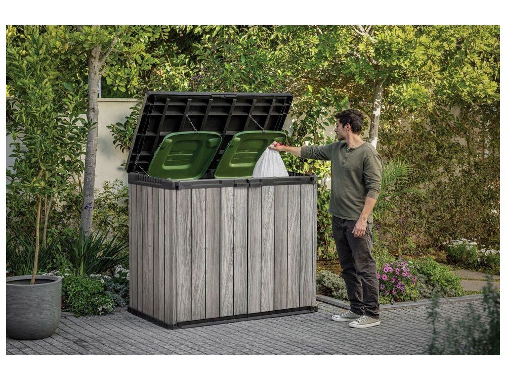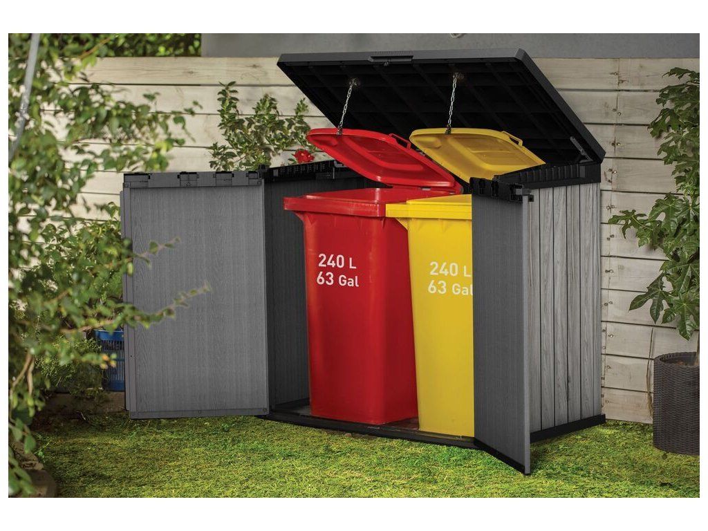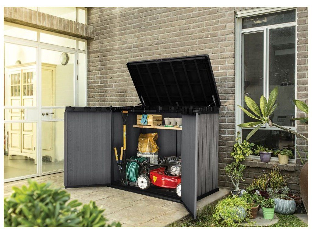 Skříňka umožňuje pohodlně uložit vše, co chcete mít po ruce na Vaší zahradě. Ideální pro uschování zahradního nářadí, zahradních doplňků nebo sportovního vybavení. Je možné do ní také uschovat popelnice.