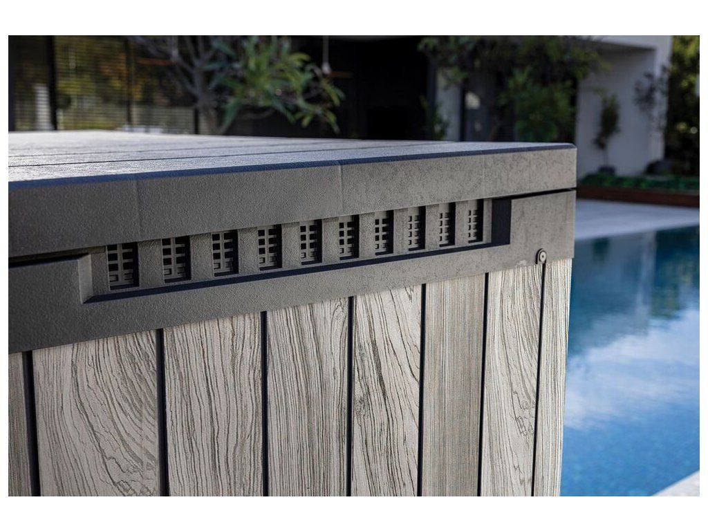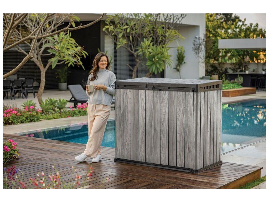 Designová, plastová skříň z řady DECO HORIZONTAL STORE IT OUT v provedení STORM GREY disponuje úložným prostorem o objemu 1 150 L.