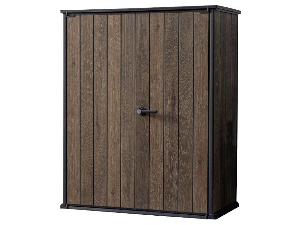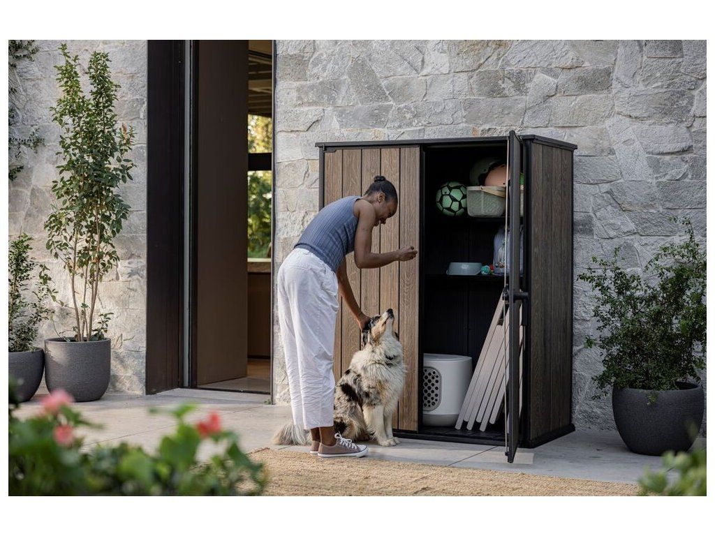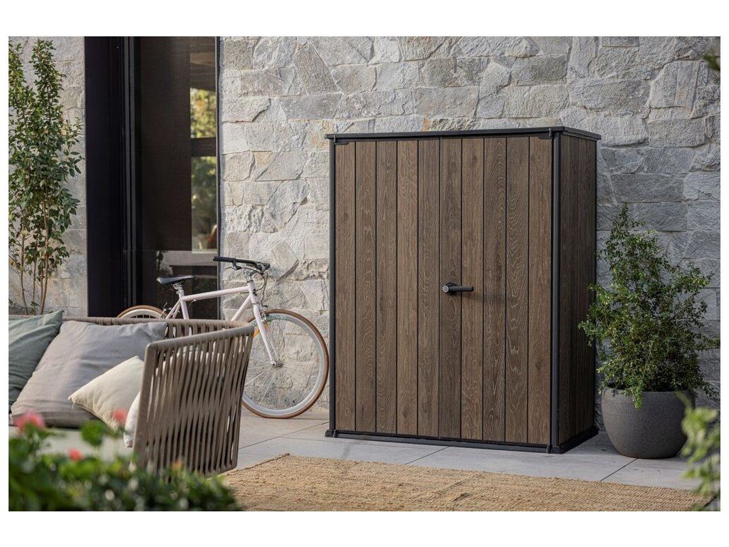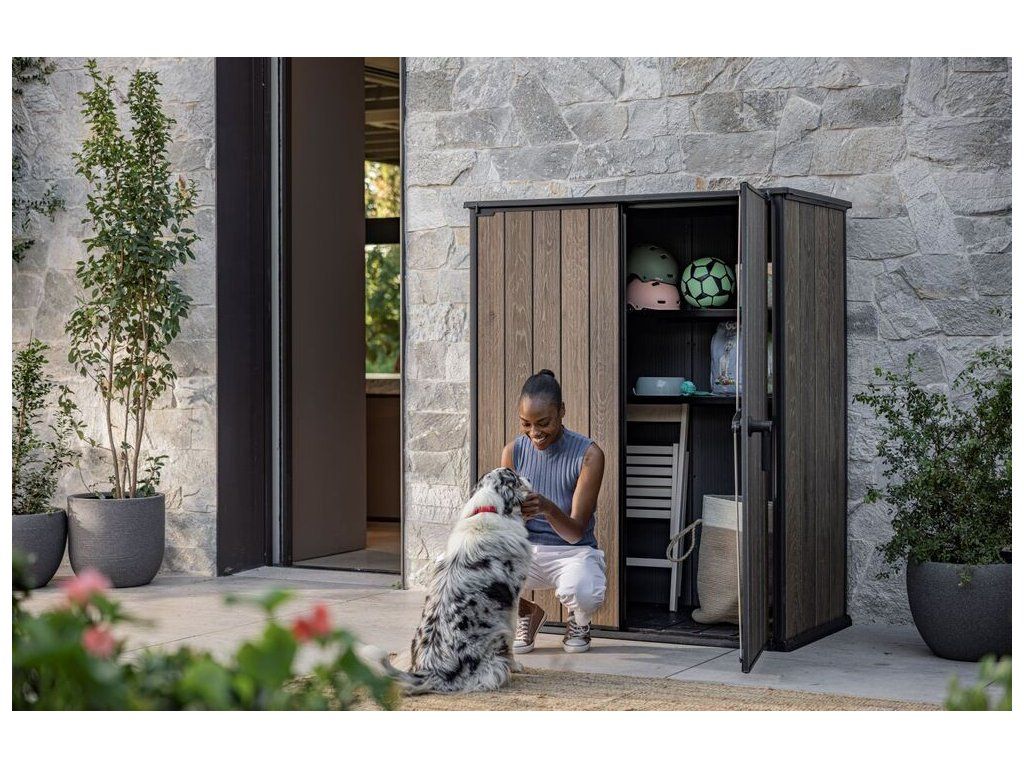 - Jednotný design: Skříň v elegantním odstínu vlašského ořechu (walnut) je součástí řady SIGNATURE, což vám umožní sjednotit exteriér s dalšími prvky, jako je zahradní domek nebo skříň na popelnice.