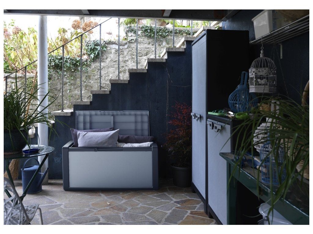 Stylový design v šedočerném provedení se hodí do každého prostoru – na terasu, balkon, zahradu či do garáže. Box je voděodolný, takže se nemusíte obávat uložení polštářů, dek či jiných textilií. Pro vyšší bezpečnost je navíc možné jej uzamknout pomocí visacího zámku (není součástí balení).
