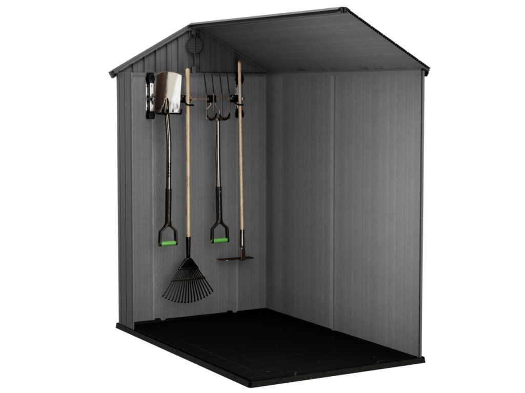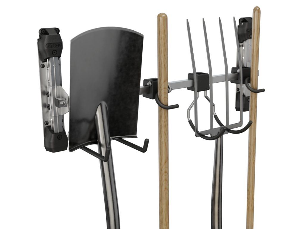 Držák je kompatibilní se všemi zahradními domky značky KETER (s výjimkou řady Factor) a s maximální nosností 36 kg je ideální pro zavěšení široké škály nástrojů – každý háček unese až 9 kg.