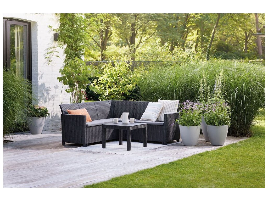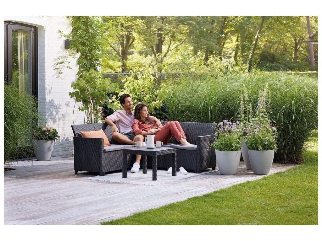 Proměňte svou terasu, balkon nebo dvorek soupravou Marie, která je vyrobena z lisovaného plastu v imitaci přírodního ratanu. Souprava se skládá z rohového pětimístného sofa a stolku.