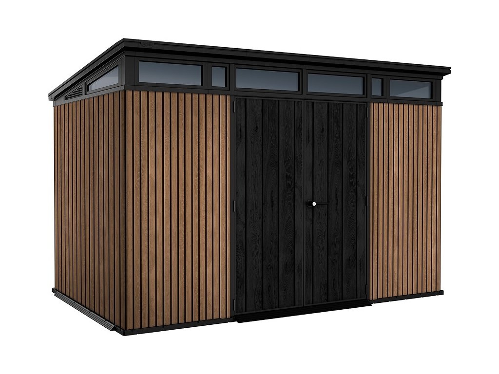 Bezúdržbový domek PENT 11x7 je vyroben z jedinečného materiálu DECOCOAT, který je inspirován moderním vzhledem v imitaci dřeva. Domek má robustní konstrukci s dvojitými stěnami a kovové výztuhy.