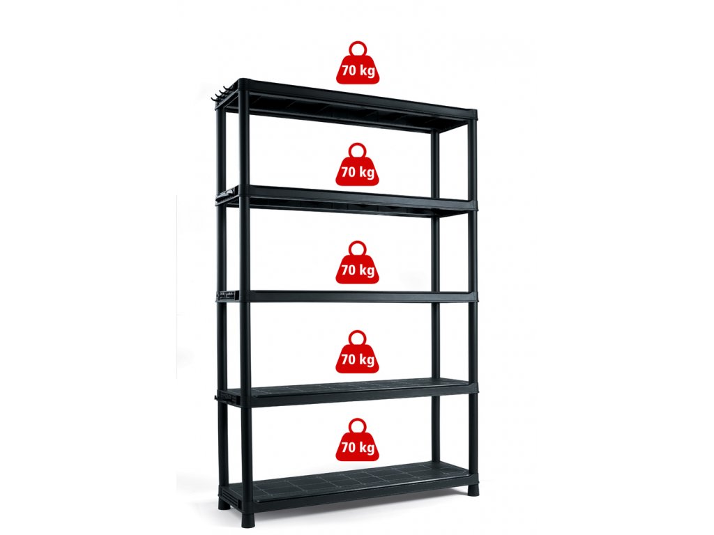 Každá z 5 poliček unese až 70 kg a robustnost celého regálu ještě posilují 2 kovové výstuhy.