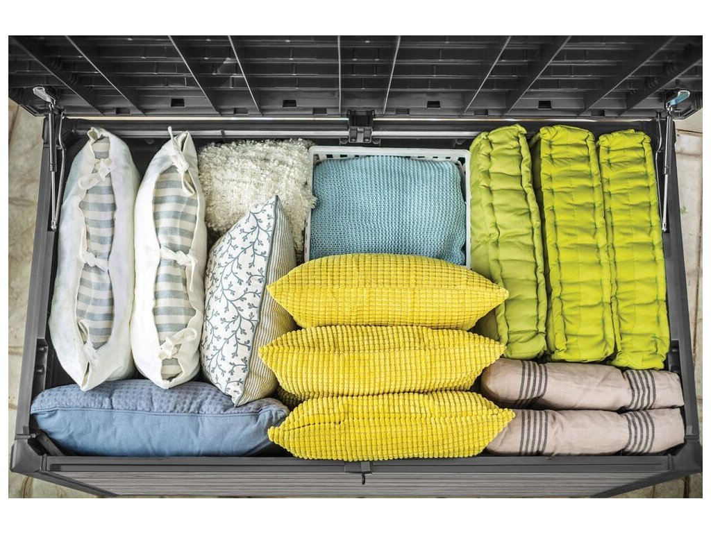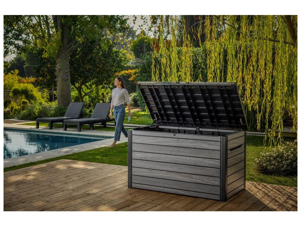 - Prostornost a organizace: Objem 870 L poskytuje dostatek místa pro uložení různých zahradních potřeb, jako jsou podušky, květináče a další doplňky. Jednoduchému otevírání pomáhají hydraulické písty, díky nimž víko zároveň drží v otevřené poloze.