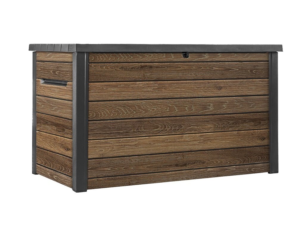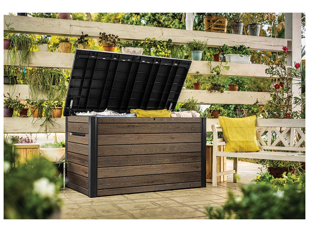 - Jednotný design: Úložný box v elegantním odstínu vlašského ořechu (walnut) je součástí řady SIGNATURE, což Vám umožní sjednotit exteriér s dalšími prvky, jako je zahradní domek nebo vysoká úložná skříň či skříň na popelnice.