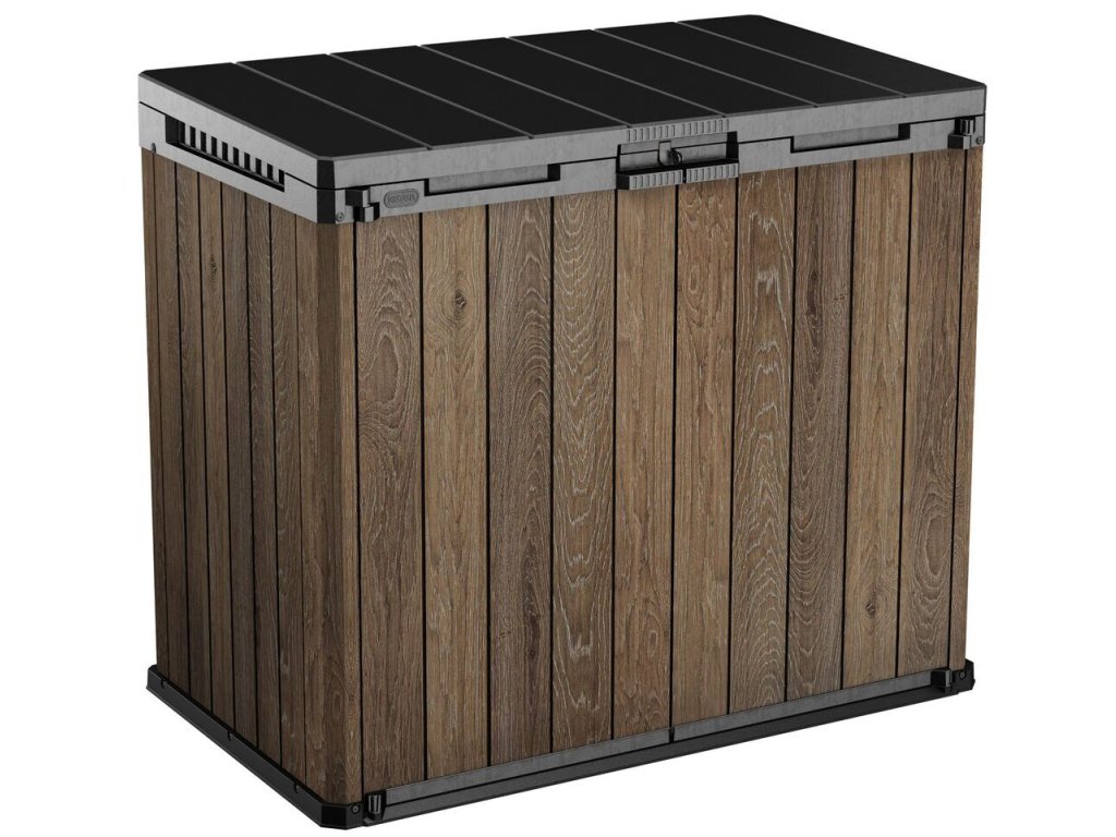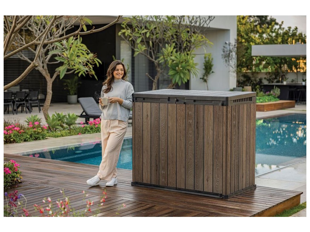 Designová, plastová skříň z řady DECO HORIZONTAL STORE IT OUT v provedení WALNUT disponuje úložným prostorem o objemu 1 150 L.