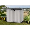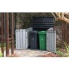 Úložná skříň se hodí všude, kde je nutné uschovat zahradní doplňky, nářadí nebo např. popelnice (dvě popelnice o objemu 120l).