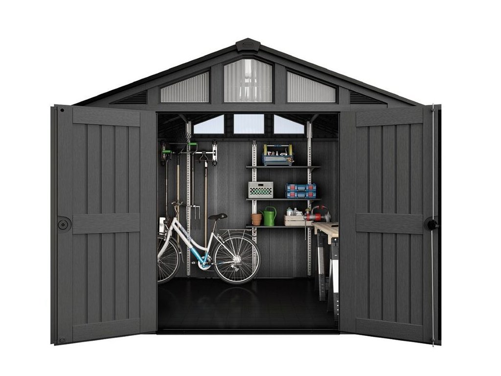 Se širokými dvojitými dveřmi můžete do domku STRONGHOLD 10x8 uskladnit jízdní kola, sekačku na trávu, nářadí, truhlářskou dílu či spoustu dalších zahradních doplňků.